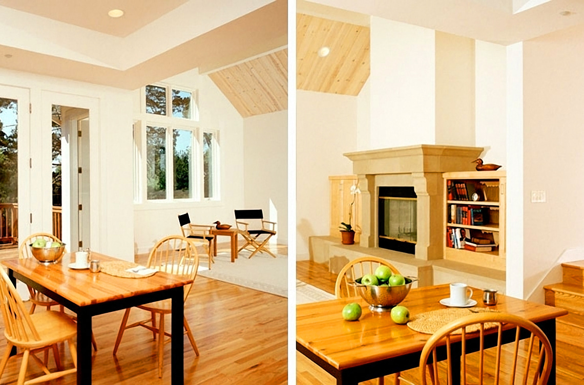 This La Selva Beach craftsman style house has, as it’s self-imposed design requirement, a chimney, interior and exterior French doors, and windows, each centered individually between two roof beams used throughout the house. The vaulted ceilings and rear southern exposure, allow for a bright and airy atmosphere. Built by James Huyck